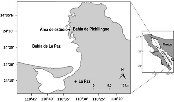 La bahía de La Paz se localiza en la parte suroriental de la península de Baja California (fig. 1) y el sitio de instalación de las estructuras de cultivo estaba en la punta suroeste de la bahía de Pichilingue.