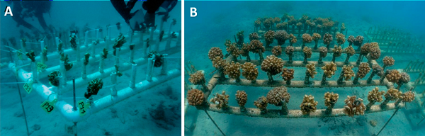 Como respuesta a los efectos de estas perturbaciones, en las últimas décadas han aumentado los esfuerzos de protección mediante la designación de áreas naturales protegidas (Mellin et al., 2016), sin embargo, estas acciones han sido insuficientes ya que la gran mayoría de sitios con arrecifes aún no están bajo regímenes de protección y permanecen expuestos a usos humanos indebidos (Burke et al., 2011). El escenario descrito ha propiciado la búsqueda de alternativas que se sumen a la protección para mitigar el deterioro de estos ecosistemas y entre los principales enfoques se encuentra la restauración, proceso que busca ayudar a que un hábitat degradado pueda volver a un estado lo más cercano posible del original, con el objetivo de que sea autosuficiente y sea capaz de adaptarse a los cambios ambientales (Bayraktarov et al., 2020). En el caso de los arrecifes, uno de los enfoques más prometedores es la silvicultura marina o cultivo de corales, una técnica que consiste en 2 fases: en la primera se cultivan los fragmentos o colonias de coral en laboratorios o zonas marinas designadas ("viveros") y en la segunda se trasplantan las colonias ya desarrolladas a sitios que han sufrido algún nivel de degradación (Horoszowski-Fridman y Rinkevich, 2016). La fase de vivero tiene como finalidad proteger a los fragmentos de coral durante las etapas de desarrollo tempranas, cuando éstos son más vulnerables ante las condiciones ambientales y con la intención de que sean trasplantados cuando tengan un mayor tamaño y las probabilidades de supervivencia sean mayores (Boström-Einarsson et al., 2020).