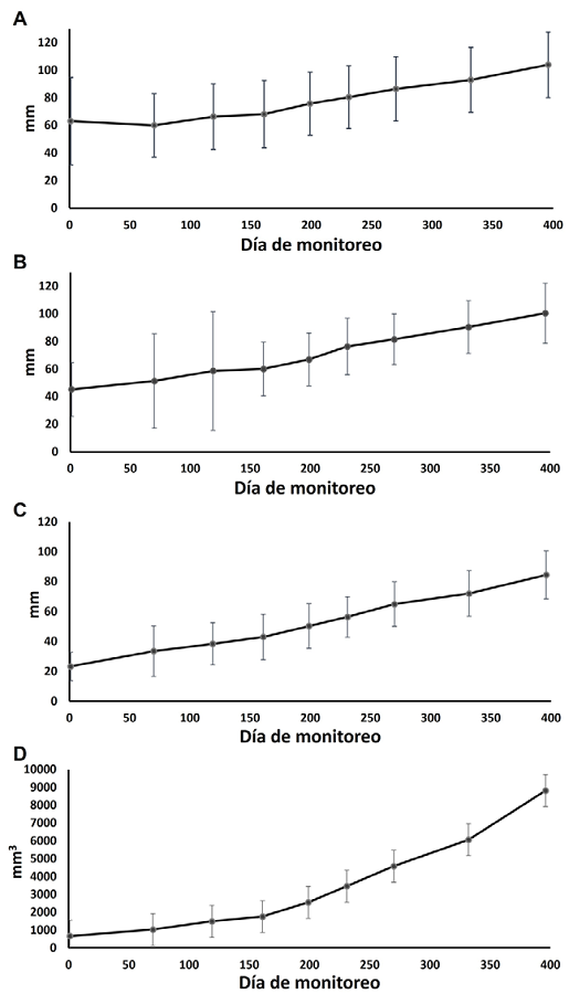 Los datos obtenidos después de 396 días de seguimiento muestran que la altura de los fragmentos al final del estudio fue de 103.88 ± 2.43 mm en promedio y error típico; ésto representa un incremento neto de 40.76 mm sobre la altura inicial, que fue de 63.12 ± 5.98 mm en promedio y se traduce a un aumento de 64% (fig. 4A). Por otro lado, se registró un diámetro mayor final de 100.48 ± 2.22 mm en promedio, equivalente a un aumento de 55.19 mm sobre los valores iniciales que fueron de 45.29 ± 3.66 mm (121% superior; fig. 4B). El diámetro menor fue de 84.52 ± 1.68 mm en promedio al final del estudio, incrementando 61.17 mm sobre la línea base (23.35 ± 1.77 mm; incremento de 262%; fig. 4C). Finalmente (fig. 4D), se registró un volumen final de 8,822.03 mm3, con un aumento total promedio de 8,104.60 mm3 que equivale a 1,221% respecto al valor inicial (667.43 mm3).