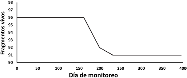 Al final del estudio, 95% de los fragmentos sobrevivió; 91 de 96 en total (fig. 5). La pérdida que se registró fue por el desprendimiento de 4 piezas (4%) y por la muerte de una (1%), asociada al crecimiento algal. La mortalidad se concentró entre los días 78-116 del estudio, que corresponde a los meses de junio-julio, mientras que el desprendimiento de fragmentos se registró entre los días 78-148, en julio-agosto. La tasa de mortalidad obtenida fue de 0.017 ± 1.34 organismos/día (r2 = 0.73, p = 0.003).