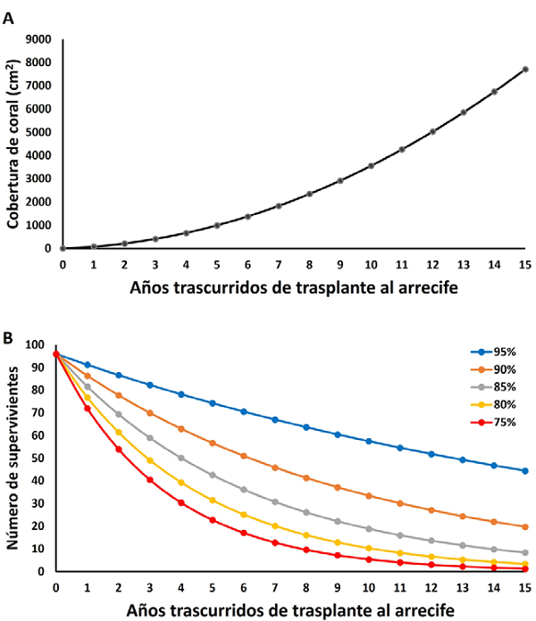 Finalmente, se plantearon modelos para estimar la cobertura de coral esperada cada año una vez que los fragmentos fueran trasplantados al arrecife, tomando en cuenta su velocidad de crecimiento y la mortalidad estimada. Primero se tomó el promedio de diámetro mayor y menor que tenían las 96 piezas individuales al inicio del experimento (45.2 × 23.3 mm) y a ese valor se le adicionó el correspondiente a la tasa anual de crecimiento estimada en el campo para cada dimensión, bajo la suposición que ésta se mantiene constante ya que se ha demostrado que para el género Pocillopora el cambio en tamaño varía localmente en menos de 15% (Medellín-Maldonado et al., 2016). Luego, por medio del producto de cada par de valores se calculó la cobertura anual del fragmento sobre el fondo; este proceso se repitió por un intervalo de 15 años. En paralelo, tomando en cuenta la cifra inicial de corales del experimento, se calculó el número de corales vivos por 15 años a partir de 5 escenarios de supervivencia anual: 95% (equivalente al valor estimado en el campo; ver Resultados) y otras 4 posibilidades que implican mayor mortalidad causada por algún agente natural o antropogénico (supervivencia de 90%, 85%, 80% y 75%). Una vez con estos insumos, para saber la cobertura de fondo que los corales restaurados ocuparían cada año, se multiplicó el número de organismos supervivientes por la superficie de fondo que ocupa cada uno en promedio.