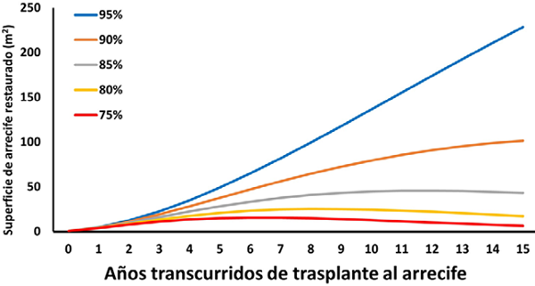 Al multiplicar el número de organismos que se espera sobrevivan cada año en el futuro por la superficie de fondo que ocupa cada uno en promedio (fig. 7), puede observarse que partiendo de un número de 96 fragmentos que al ser instalados en los viveros (año 0) en conjunto sumaban una superficie total de 1,015 cm2, la proyección a futuro considerando una supervivencia de 95% indica que en 5 años la cobertura sería de 73,968 cm2; ésta se elevaría a 204,717 cm2 en 10 años y llegaría a 342,826 cm2 en 15 años (casi 300 veces superior). Para los escenarios de supervivencia de 90% y 85%, la cobertura esperada 3 lustros en el futuro sería de 152,355 y 64,640 cm2, respectivamente (64 a 150 veces superior al valor inicial), y aún para los peores escenarios (supervivencia de 80% o 75%), se tendrían a 15 años coberturas de 9,888 a 26,035 cm2, mucho mayores a las originales. Estos resultados demuestran que un ejercicio de restauración basado en los corales contenidos en los viveros del presente experimento sería muy exitoso en el sentido de incrementar a largo plazo la cantidad de corales y por ello, la condición de los arrecifes que se tenga interés en recuperar.