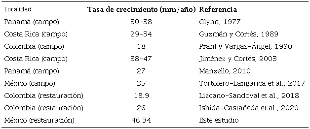 Las tasas de crecimiento coralino en altura obtenidas en el presente estudio fueron similares a lo reportado en otros trabajos realizados en el Pacífico mexicano. En el experimento se tuvieron valores de 0.13 ± 0.01 mm/ día de altura, equivalente a 46.34 ± 2.35 mm/año (fig. 4A), mientras que para el mismo género Pocillopora, Tortolero-Langarica et al. (2019) registraron en el Parque Nacional Islas Marietas, Nayarit, aumentos ligeramente menores de 44.7 ± 1.07mm/año y Liñán-Cabello et al. (2010) reportaron en el arrecife de Carrizales, Colima, crecimientos promedio de 38.9 y 35.2 mm/año utilizando diferentes técnicas de restauración. En contraste, Muñiz-Anguiano et al. (2017) obtuvieron en el mismo arrecife de Carrizales valores de crecimiento en altura muy bajos de 9.7 y 9.3 mm/año en 2 sitios, situación que podría estar relacionada con una fuerte anomalía de temperatura que se presentó en la zona durante el tiempo de estudio y por la presencia de comunidades algales y bioerosionadores del coral.