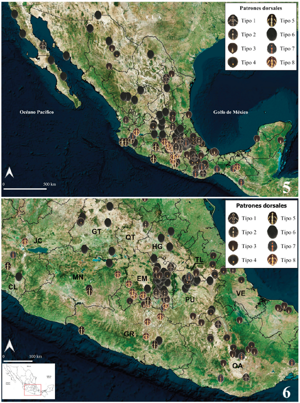 Levi (1959) analizó la variación de los patrones del opistosoma de L. mactans en el mundo, con 11 patrones dorsales diferentes para México. En el presente trabajo se encontraron 6 de los 11 patrones dorsales reportados por Levi (1959) y se reportan 2 nuevos para el país: tipos 1 y 3 (Tabla 5). El patrón tipo 6 fue el que se observó en el mayor número de ejemplares (144) y la mayor distribución geográfica (Tabla 5; Figs. 5, 6). Los estados con la mayor variación en los patrones dorsales de L. mactans fueron Guerrero y Morelos, con todos los tipos de patrón dorsal a excepción del tipo 4 (Tabla 5).