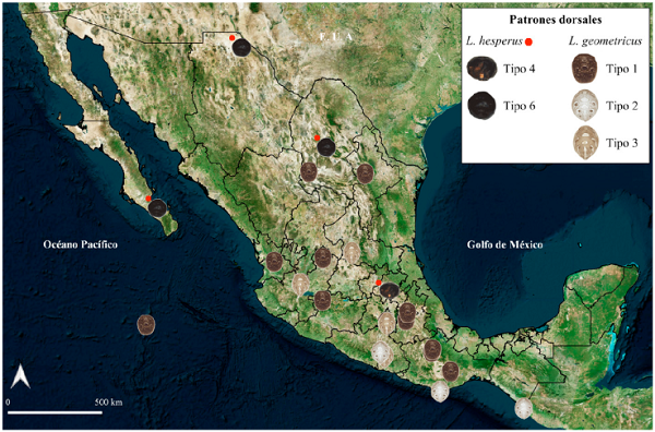 La variación del patrón dorsal de L. hesperus se observó en ejemplares de 4 estados de México, y se incluyeron los ejemplares de Coahuila (Fig. 7; Desales-Lara et al., 2018). El patrón más común fue el tipo 6, presente en los ejemplares de Baja California Sur, Chihuahua y Coahuila (Fig. 7). El patrón tipo 4 únicamente se encontró en el ejemplar de Hidalgo (Fig. 7).