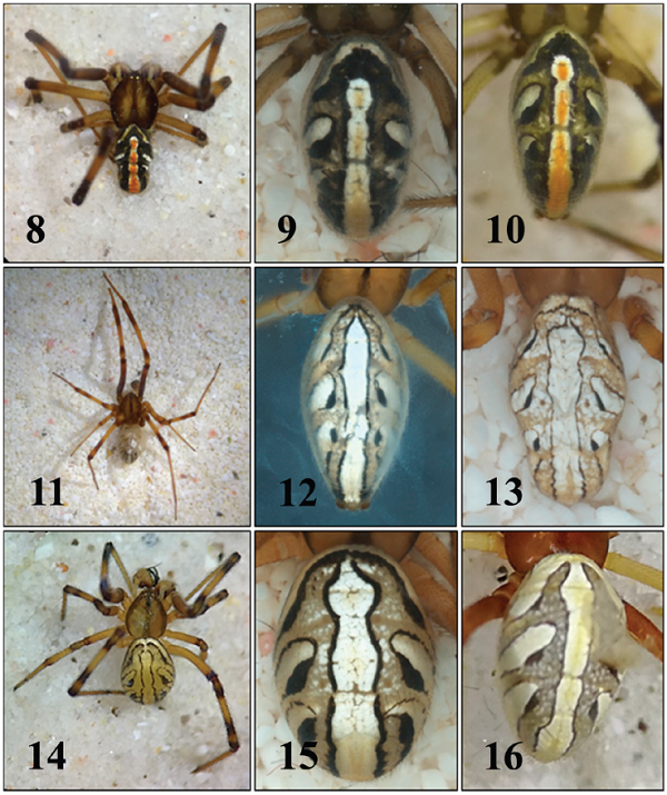 Los machos de las 3 especies presentaron un patrón dorsal en el opistosoma similar (Figs. 8, 11, 14), la variación interespecífica radicó en la coloración general del opistosoma (Figs. 8-16). En L. mactans se presentan tonos de café obscuro a negro (Figs. 8-10), en L. hesperus tonalidades de café claro o crema (Figs. 11-13), mientras en L. geometricus tonalidades de café o gris (Figs. 14-16). Los machos de L. mactans, además, presentan tonos rojizos en la línea media del opistosoma (Figs. 8-10), lo cual no se observa en las otras 2 especies (Figs. 11-16).