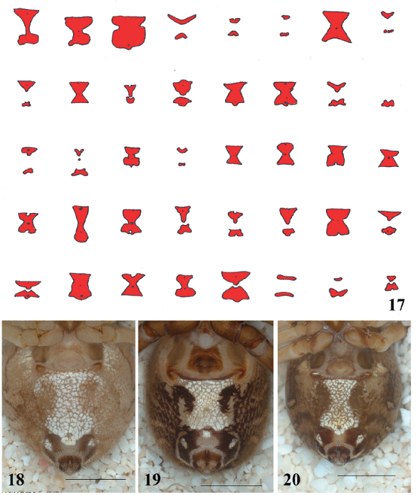 Variación del patrón ventral “reloj de arena” del opistosoma. El patrón ventral del opistosoma fue revisado en las mismas 384 hembras en las que se analizó el patrón dorsal. De las 3 especies para México, el patrón de “reloj de arena” de L. mactans fue el que presentó la mayor variación, con 40 patrones diferentes, sin contar la ausencia total de éste (Fig. 17). Con estos resultados, a los 12 patrones ventrales reportados por Levi (1959) aumentan a 21 patrones. La ausencia del “reloj de arena” fue el patrón que más se presentó en el mayor número de ejemplares de L. mactans. En Latrodectus geometricus se observó dicho patrón siempre completo y poco variable, de color rojo o naranja, con un par de marcas pequeñas posteriores al “reloj de arena” cerca de las hileras (Figs. 18-20). En el caso de L. hesperus, con el limitado material revisado no se analizó dicha variación, encontrando tanto ejemplares con el patrón completo, como el patrón ausente.
