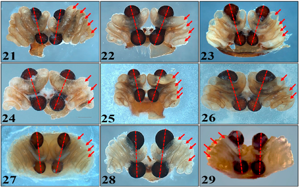 Variación morfológica de caracteres taxonómicos. Las hembras de L. mactans y L. hesperus presentan un solapamiento de caracteres en estructuras sexuales y somáticas debido a su variabilidad (Figs. 21-26). Estas especies al pertenecer al clado mactans, presentan una morfología de estructuras sexuales internas (espermatecas y ductos copuladores) muy similares, con 4 o 5 vueltas del ducto copulador en el caso de L. mactans (Figs. 21-23), y 3 o 4 en de L. hesperus (Figs. 24-26).