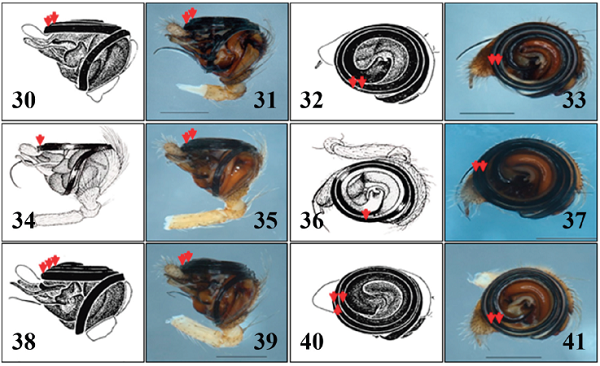 En el caso de los machos, Kaston (1970) indica que el émbolo del pedipalpo de L. mactans presenta poco más de 3 vueltas (Figs. 30, 32) y el pedipalpo del macho tipo de L. hesperus, únicamente 2 vueltas (Figs. 34, 36), mientras que el de L. geometricus tiene casi 4 vueltas (Figs. 38, 40). Sin embargo, este carácter parece ser variable incluso dentro de una misma especie, en L. geometricus puede variar de 3 a casi 4 vueltas (Figs. 40, 41). De esta manera, el número de vueltas del émbolo debe de ser considerado con precaución para identificación a nivel de especie. El uso de caracteres somáticos también puede aportar información relevante en conjunto con los caracteres sexuales para la identificación de especies, incluso caracteres ultra morfológicos (sedas del opistosoma) han sido caracteres útiles, como se observó en L. umbukwane (Wright et al., 2019).