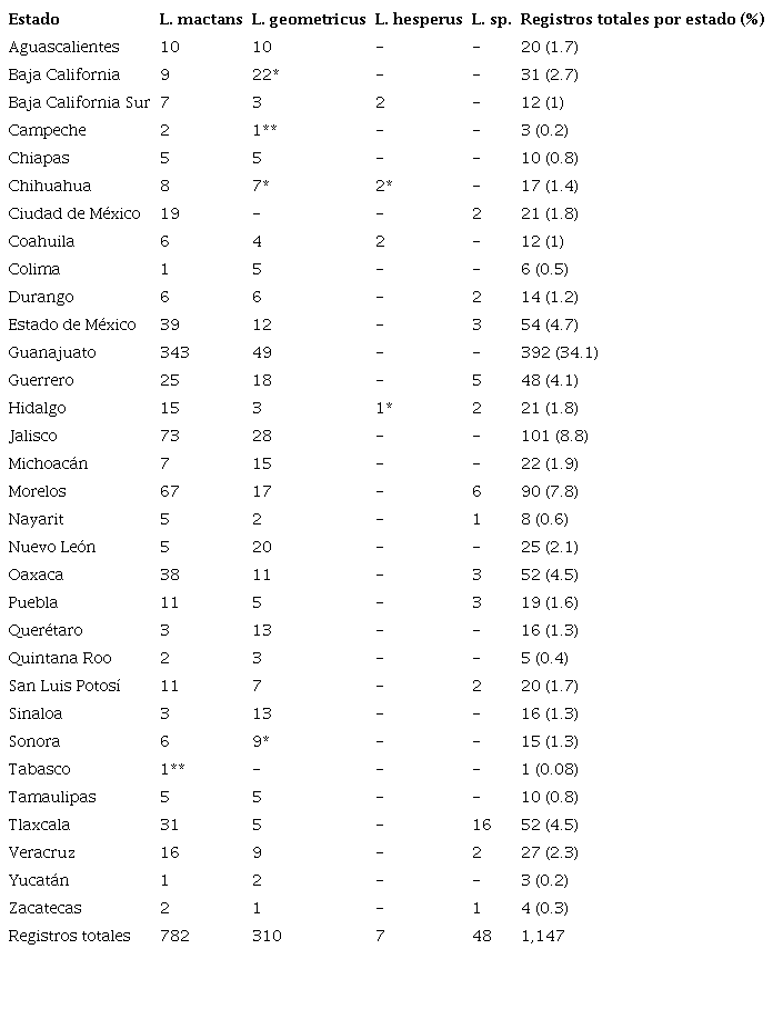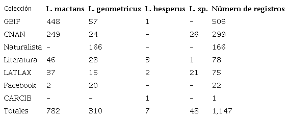 Se elaboró una base de datos en Excel con los datos obtenidos tanto de colecciones científicas revisadas, como de ejemplares recolectados en campo, registros de literatura y grupos especializados de redes sociales en línea (Facebook) como: Insectos y otros artrópodos de México, Arácnidos de la República Mexicana, Arañas de México y Reivindicando a las arañas. También se utilizaron las bases de datos del GBIF (GBIF.org, 2019), Naturalista (Naturalista, 2019) y del Portal de Datos Abiertos de la UNAM (2018). Para considerar los registros obtenidos de dichas fuentes (Facebook, GBIF y Naturalista), se tomaron en cuenta los siguientes criterios: 1) pertenecer a un ejemplar depositado en alguna colección científica perteneciente a alguna institución académica reconocida (museo o universidad) (GBIF); 2) el ejemplar debe haber sido identificado por algún especialista reconocido de dicho portal (Naturalista y Facebook); 3) en caso de ser fotografía, la especie debe poder ser determinada mediante caracteres visibles (patrón dorsal, coloración de las patas u ovisaco) (Naturalista y Facebook); 4) contar con datos completos de la localidad exacta donde el ejemplar fue observado (Facebook). Basado en los criterios anteriores, la base de datos obtenida del portal de Naturalista y Facebook cuenta únicamente con los registros de L. mactans y L. geometricus, mientras que de GBIF se descargaron los registros de las 3 especies para México. La georreferenciación se realizó con el programa Google Earth Pro v.7.3.2.5491 y el sistema de coordenadas geográficas WGS 84. Los registros georreferenciados fueron los pertenecientes a las colecciones científicas y literatura, así como los de Facebook que únicamente contaran con la localidad de recolecta pero sin coordenadas geográficas.
