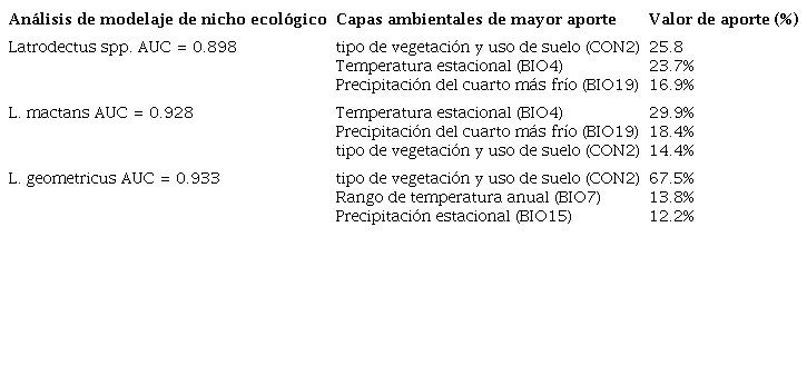 El análisis de MNE para todos los registros del género Latrodectus con un valor de AUC de 0.898, mostró predicción en la mayor parte del país, modelando en todas las provincias biogeográficas (Fig. 2). Sin embargo, las provincias biogeográficas de la Sierra Madre Occidental (SMOc) y Sonorense (Son) mostraron una limitada predicción. La zona centro-sur de México es la región que presentó los valores más altos de predicción (Fig. 2). Las 3 capas ambientales con el mayor aporte fueron: tipo de vegetación y uso de suelo (CON2), temperatura estacional (BIO4) y precipitación del cuarto más frío (BIO19) (Tabla 2).