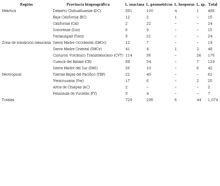 Latrodectus hesperus: los registros de esta especie en México son recientes, para los estados de Baja California Sur y Coahuila (Jiménez et al. (2015) y Desales-Lara et al. (2018), respectivamente). El registro de Baja California por Jiménez et al. (2015) no cuenta con coordenadas, por lo que el de Coahuila, por Desales-Lara et al. (2018), es el primero bien documentado. Los registros de esta especie corresponden a la zona norte y centro del país y abarcan los estados de Baja California Sur, Coahuila, Chihuahua e Hidalgo (Fig. 1), con 9 registros en estos 2 últimos estados (Tabla 3). Hasta ahora, la provincia biogeográfica del DC cuenta con 4 de los 6 registros de L. hesperus en el país, mientras que los otros 2 pertenecen a las provincias de BC y SMOr (Tabla 4; Fig. 1). Cabe mencionar, que todos los registros se encontraron en pastizales y matorrales con clima semiárido a muy árido principalmente (Conabio, 2019; Espinosa et al., 2008; Morrone, 2005).