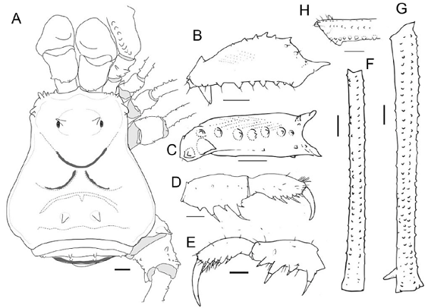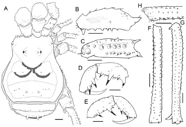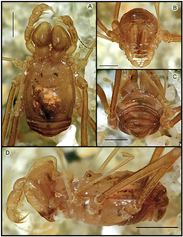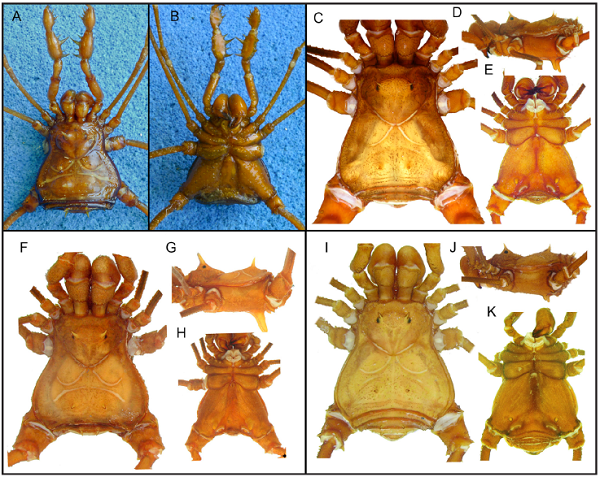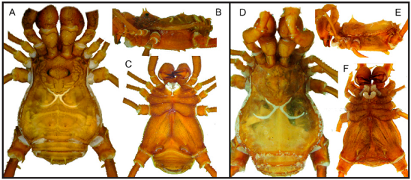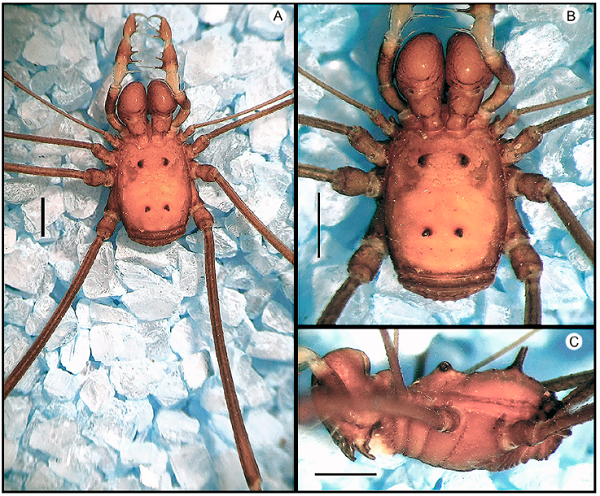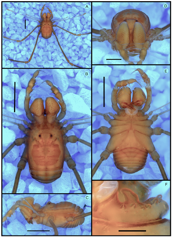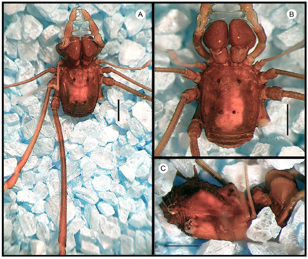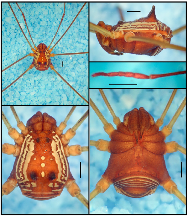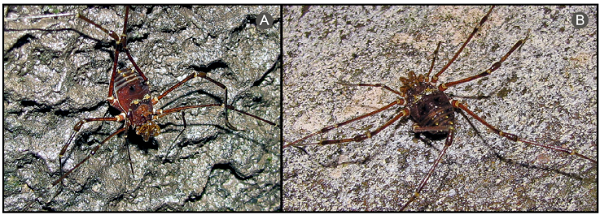 Details of the descriptions of both species agree in minutiae, except for body size and legs length, which differ significantly. See for example the shape, the ornamentation, and the pattern of yellow spots of the dorsal scutum (Figs. 5A-C, 6A-D). We still decided to carry on with the proposed synonymy, knowing that in Laniatores there may be wide gaps in dimensions for populations far apart.