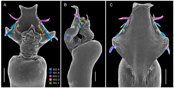 Kury, A. B., & Villarreal, M. O. (2015). The prickly blade mapped: establishing homologies and a chaetotaxy for macrosetae of penis ventral plate in Gonyleptoidea (Arachnida, Opiliones, Laniatores). Zoological Journal of the Linnean Society, 174, 1-46. https://doi.10.1111/zoj.12225