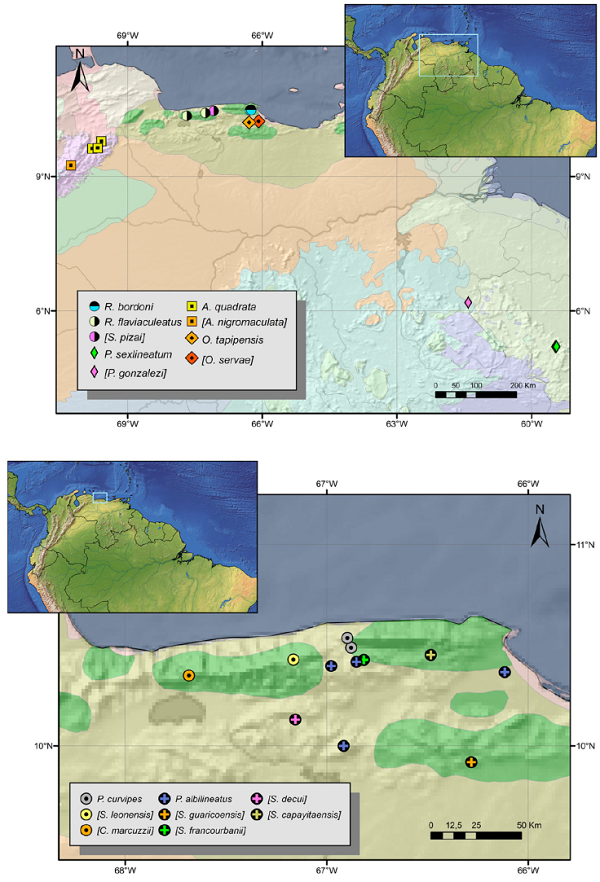 On the other hand, there is a recurring pattern of species distributed in the Venezuelan Bolívar state and in Guyana, generating thus a potential taxonomic trap only because national borders are crossed. This pattern is exemplified by: 1) scorpiones. Ananteris venezuelensis G. S., 1972 and Tityus clathratus C. L. Koch, 1844 (Lourenço, 2012, 2013), although, this last species has a slightly wider distribution, reaching the Cordillera de la Costa in Venezuela (Moreno-González et al., 2019). 2) Birds. Atlapetes personatus (Cabanis, 1849); Poecilotriccus russatus (Salvin and Godman, 1884); Quiscalus lugubris Swainson, 1838 (Lepage, 2020). 3) Frogs. Oreophrynella quelchii Boulenger, 1895; Tepuihyla warreni (Duellman and Hoogmoed, 1992), recorded in Guyana and Venezuela (Villarreal et al., 2002).