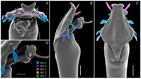 Individuals of the species were imaged from varied sources, as the present extremely unfavorable context makes standardization difficult to attain (e.g., the devastating fire in the National Museum of Rio de Janeiro; many government policies contrary to environmental conservation; the pandemic). We mostly used Nikon 5200, Canon PowerShot S3IS, and Sony Cybershot DSC-V1 cameras attached to a stereomicroscope. The multiple images of each species at different focal planes were combined with Zerene Stacker or CombineZP to increase the depth of field and were then edited in Adobe Photoshop CC2014 software. Scanning Electron Microscopy (SEM) was carried out with a JEOL JSM-6390LV microscope at the Center for SEM of the Museu Nacional/UFRJ with an accelerating voltage of 10 kV after sputter-coating with gold-palladium. All measurements are in mm unless otherwise noted.