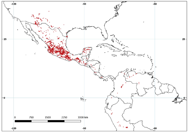 The database contained 2,078 records and out of these, we georeferenced 966 of them (46.5%). Even though several publications failed to state how or if the data were georeferenced, this proportion compares with similar analyses. For instance, Munguía-Lino et al. (2015) georeferenced 47% of the occurrence points in the tribe Tigridieae (Iridaceae) of North America and Carrasco-Ortiz et al. (2019) did the same for 61% of the records in Dahlia (Asteraceae). In Sedum (Crassulaceae) from the Sierra Madre del Sur (Mexico), Aragón-Parada et al. (2019) georeferenced 91% of the geographical data. The confidence of our results depended on the taxonomic identification and the quality of geographic coordinates included the estimated ones. We followed the SAGA protocol and according with Bloom et al. (2017), this method outpaced any other georeferencing scheme.