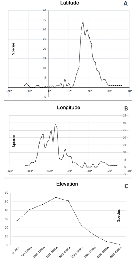 Latitudinally, Echeandia presented its greatest diversity between 17° and 21° N (Fig. 3A). The genus was markedly diverse at 97°, 99°, and 103° W (Fig. 3B). At one extreme, Echeandia campechiana Cruden, E. crudeniana Aarón Rodr., E. luteola Cruden, and E. texensis Cruden grew at sea level in Mexico and the USA. In contrast, E. herrerae (Killip) Cruden inhabited the highest elevational limit of the genus at 4,121 m, in Peru. In Central America, E. altipratensis Cruden reached 3,550 m, in Guatemala. Meanwhile, in Mexico E. durangensis (Greenm.) Cruden and E. longipedicellata Cruden were found at 3,300 m. However, most species were collected between 1,500 and 2,500 m of elevation (Fig. 3C).