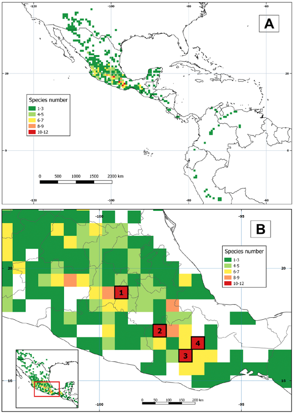 The grid analysis revealed 4 cells with high species richness (Fig. 4A). Cell 1 had 12 species and was located in the limits among Ciudad de México, Estado de México, and the state of Morelos. Cells 2, 3, and 4 contained 11 species each. Cell 2 occurred in the Oaxaca-Puebla state border, while cells 3 and 4 were situated in the confluence of the Central Valleys with the southern and northern mountains in Oaxaca (Fig. 4B). All cells with more than 3 species were in Mexico. In Central America, one cell in Guatemala had 3 species. El Salvador, Honduras, and Panama had cells with 2 species, while the rest of Central and all South America presented only 1 species per cell (Fig. 4A).