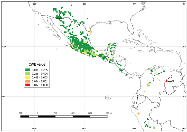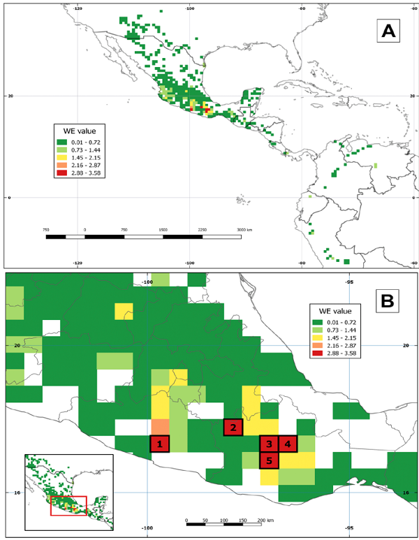 The WE analysis revealed 5 cells with the highest values (2.88 to 3.58), all located in Mexico. Cell 1 fell in Guerrero but cells 2, 3, 4, and 5 situated in Oaxaca. In Central and South America, the cell values varied from 0.01 to 1.44 (Fig. 5A). Cells with 1.45 to 2.15 values were identified in Ciudad de México, Jalisco, Estado de México, Morelos, Puebla, and Querétaro (Fig. 5B). Even though the CWE analysis revealed 5 cells with a value of 1, these had different distribution (Fig. 6). Cell 1 located in Mexico, cells 2 and 3 in Venezuela, cell 4 in Ecuador, and cell 5 in Peru. Cells with values between 0.6 and 0.8 were observed in Panama and Peru. Finally, Mexico, the USA, Guatemala, Colombia, and Peru hosted cells with 0.4 to 0.6 values.