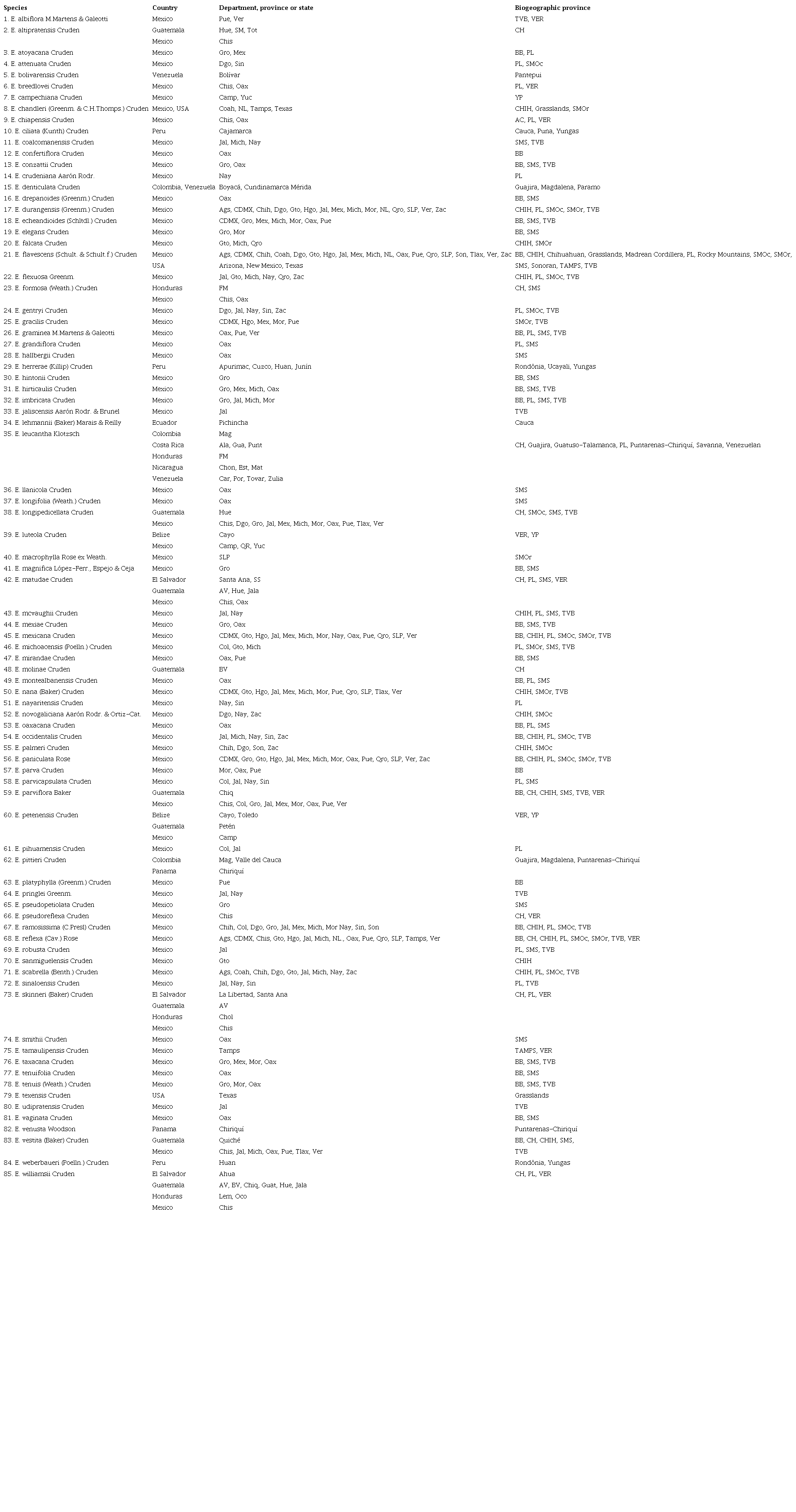We compiled taxonomic, geographic, ecological, and curatorial data from different sources to generate a database. We reviewed the Mexican herbaria CICY, CIIDIR, ENCB, HGOM, IBUG, IEB, MEXU, SLPM, UAT, UAMIZ, XAL, and ZEA. Also, we searched for the available electronic records of collections in ARIZ, ASC, ASU, BRIT, COL, MO, NMC, RENO, RM, SJNM, and SNM herbaria (Thiers, 2020). We added records from Central and Southern America contained at the Global Biodiversity Information Facility (GBIF, 2018) and included all the locations cited in Cruden (1981, 1986, 1987, 1989, 1993, 1994, 1999, 2009), Cruden and McVaugh (1989), López-Ferrari and Espejo-Serna (1995), López-Ferrari et al. (2002), Rodríguez and Ortiz-Catedral (2013), and Rodríguez and Ortiz-Brunel (2019).