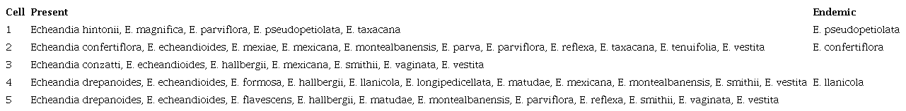 The endemic vascular flora of Mexico varies from 49.8% (Villaseñor, 2016) to 52.5% (Ulloa-Ulloa et al., 2017). Espejo-Serna (2012) estimates that 84.6% of the species of Echeandia are endemic to the country, which coincides with the 85.1% obtained in this work. Both estimates are greater than the global Mexican values. Therefore, Echeandia is a good surrogate of the endemic flora of Mexico.