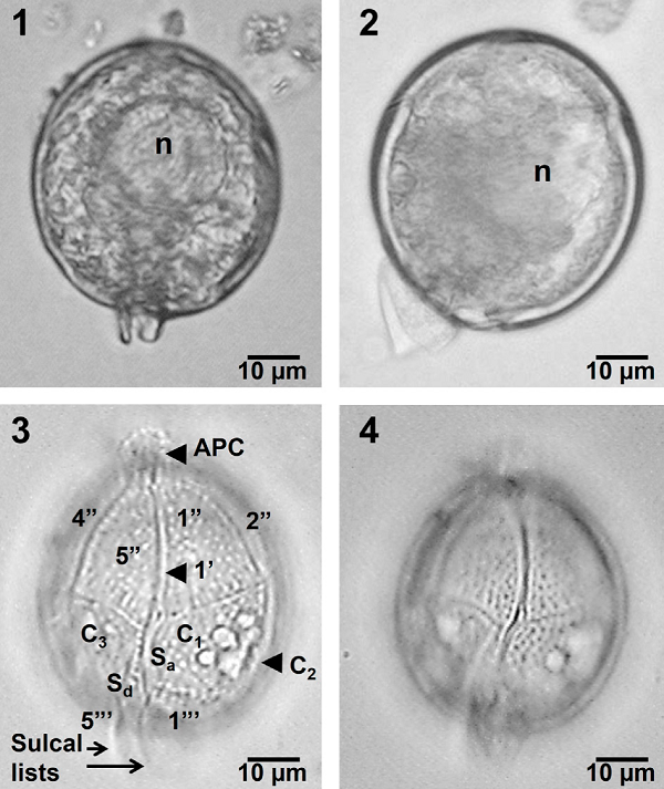 Only solitary cells of medium size were found, with a globose appearance, spherical, subspherical or ovoid in shape, some specimens slightly more elongate (larger than wide) and wider at the posterior hypotheca (Figs. 1-4). No conspicuous structures, apart from the sometimes salient sulcal list, which may be variable in length and development, and the apical pore, which may be completely unapparent or observed as a short and truncated knob (Figs. 1-4). Untreated cells showed a slightly eccentric and large nucleus, but no trace of chloroplast (Figs. 1, 2). Conversely, a specimen made transparent in ventral view showed the epitheca considerably larger than the hypotheca, the plates of the apical (1’), precingular (1" to 4", except 3"), cingular (C1 to C3), and postcingular series (1"’ and 5"’, only), 2 sulcal platelets (Sa and Sd) and also the apical pore complex (APC) at the anterior apex and the sulcal lists at the posterior apex (Figs. 3, 4). The theca is completely covered by small poroids (Figs. 3, 4).
