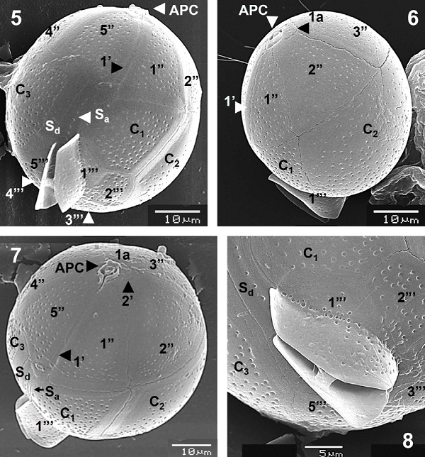 Observations by SEM confirmed the proportions of the epi- and hypotheca and plate arrangement of the species in ventral view, although postcingular plates (1"’ to 5"’) and the sulcal lists can be also visible (Fig. 5). The small postcingular plates constitute the hypotheca (Fig. 5), together with the antapical plate (1"", not shown). The plate 1’ is very narrow and long (Figs. 5-7, 9). Another specimen in lateral view made possible to observe the only intercalary plate (1a), which is rectangular and small (6.2 × 3.5 µm), close to the APC, the third precingular plate (3") and the cingular plate C2, the largest of the species (Fig. 6).