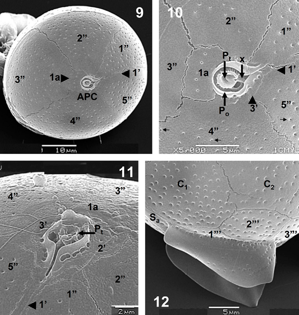 An apical view showed the APC, 1a and the second apical plate (2’), with the conspicuous sulcal plates (Sa and Sd) (Fig. 7), whereas a detailed view of the posterior part showed the sulcal list, the postcingular plates and the Sd platelet (Fig. 8). The APC, the first apical (1’), the intercalary (1a) and all precingular plates are seen in apical view (Fig. 9), whereas a detail of that view showed platelets of the APC: Po, Pt (cover platelet) and X (canal platelet) and the third apical plate (3’) (Fig. 10); the 3 apical plates (1’ to 3’), 2 being very small (2’ and 3’), and the APC are also shown (Fig. 11). The sulcal lists fairly developed and almost smooth, some plates (cingular and postcingular) and the anterior sulcal platelet (Sa) at the posterior zone, in lateral view, can be observed (Fig. 12).