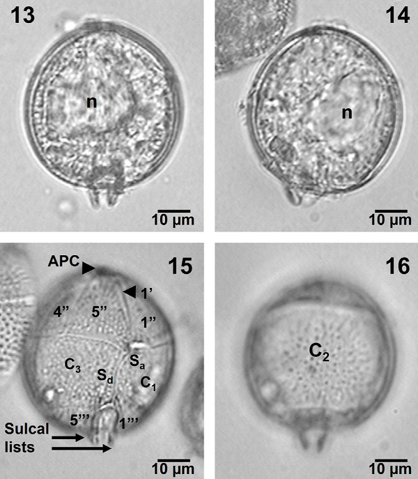 Solitary cells of medium size with a globose and spherical shape (Figs. 13-16). A very short apical protrusion indicating the APC and slight salient sulcal lists were apparent (Figs. 13-16). An untreated specimen showed a large, eccentrically located nucleus and no chloroplasts (Figs. 13, 14). Treated, transparent specimens in ventral and dorsal views showed the more reduced proportion of the epitheca in this species, and the plates arrangement (especially the precingular and cingular plates), very similar to the precedent species, but also showing the large cingular plate, C2 (Figs. 15, 16). The theca appeared covered by thick poroids and pores (Figs. 15, 16).