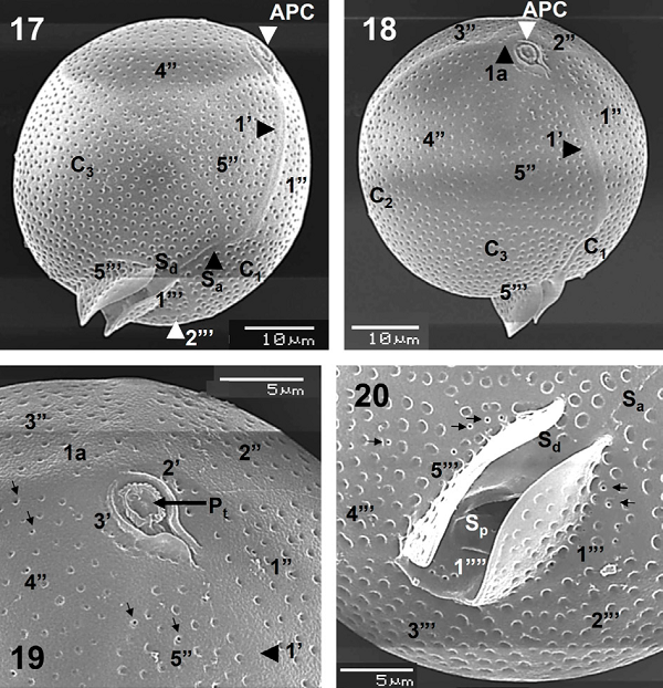The APC is not prominent (Figs. 17, 18) and the small platelets forming it were not completely seen, although the 3 apical plates (1’ to 3’) were observed (Fig. 19). The intercalary plate (1a) has, as in Blepharocysta splendor- maris, a row of 5-6 small pores (perforated poroids) (Fig. 19). An antapical view allowed to see the complete series of postcingular plates (1"’ to 5"’), the antapical plate (1""), and 3 sulcal platelets (Sa, Sd and Sp), plus the sulcal lists well ornamented with poroids (Fig. 20). The theca is covered by well-defined and deep poroids, which are fairly homogeneously distributed, with a relative high density (52-56 pores in 10 µm2, in plates C1 and C3, and 18- 19 pores in 5 µm2, in postcingular plates), and some are perforated by small pores (Figs. 19, 20).