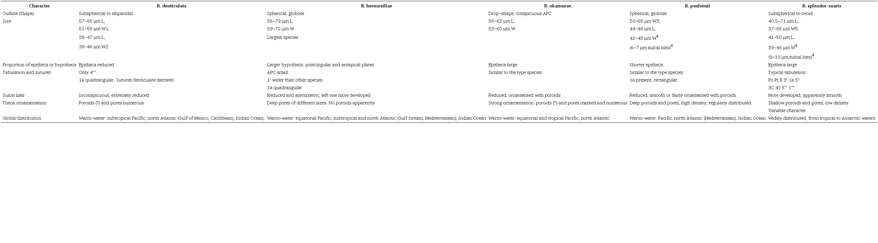 We gathered important morphological characters to distinguish all Blepharocysta species, and some distribution information is additionally included (Table 1), in order to compare these characters, facilitate the identification of the species, and emphasize their importance. From this information it is interesting to evaluate which morphological characters should be considered valuable, outstanding the "traditional" characters such as: 1) the shape of cells, 2) the relative size, 3) the development of sulcal lists, 4) position and structure of the sulcus, 5) the theca arrangement (including plates which may be lacking), and 6) type of plate sutures (linear or dentate).