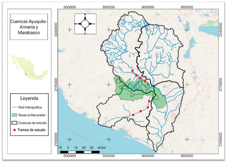 La cuenca del río Marabasco, pertenece a la región hidrológica 15. Esta cuenca nace en la zona sureste de la sierra de Manantlán y representa el límite estatal entre Jalisco y Colima (Fig. 1). La cuenca presenta una superficie de 5,439 km2, recorriendo una distancia estimada de 123 km desde su nacimiento hasta el mar (Jiménez-Román, 1980). El caudal del río no se encuentra regulado, debido a que no existe ninguna presa o infraestructura en el cauce que controle el flujo.