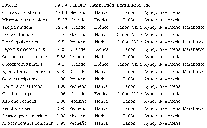 En las excretas de la nutria se registraron 16 especies de peces pertenecientes a 8 familias y 5 órdenes (Tabla 1). En el río Ayuquila-Armería se contabilizaron 16 especies y 6 en el río Marabasco. De las especies depredadas en ambos ríos, 5 fueron especies exóticas. Con respecto al tamaño, los peces consumidos por las nutrias fueron 7 especies de tamaño grande (5 exóticas y 2 nativas), 3 de tamaño mediano y 6 pequeños (todas nativas).