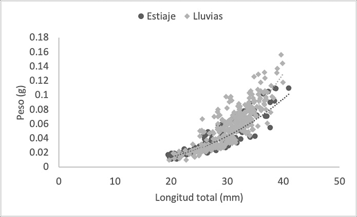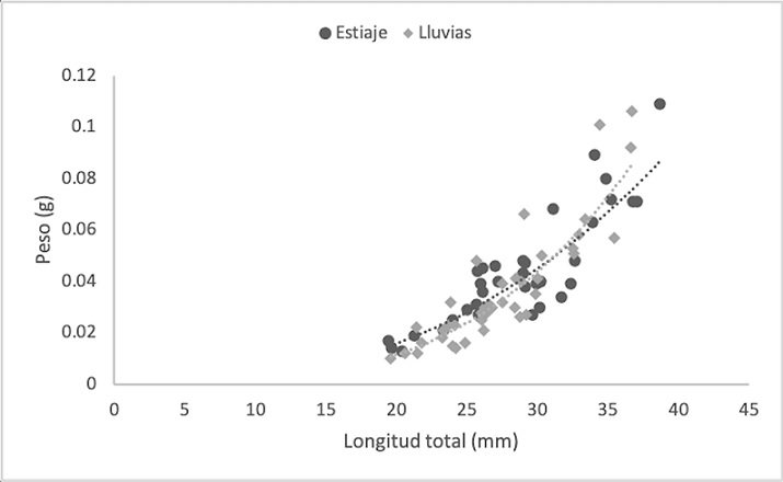 Se estudiaron un total de 412 individuos de Tozeuma carolinense, 307 recolectados en la temporada de lluvias y 105 en la de estiaje. Los resultados numéricos de cada parámetro y grupos medidos se muestran en Tabla 2. En la temporada de estiaje, el número de machos fue mayor que el de las hembras, con una proporción de 0.50:1, sin embargo, no fue significativamente diferente a la tasa esperada de 1:1 (χ2 = 0.002, p < 0.05). En la temporada de lluvias, el total de hembras fue claramente superior a los machos (0.24:1), difiriendo significativamente de la proporción 1:1 (χ2= 81.8, p < 0.05). Con los datos biométricos fue determinado el crecimiento individual, para datos agrupados y por sexo, a través de la relación peso-longitud (W = a*Lb), definido mediante el valor de la pendiente (b) y significado por una prueba de t-student (p < 0.05), la cual osciló entre 2.02 (M: estiaje) y 3.45 (DA: lluvias). Los especímenes de T. carolinense en DA, se ajustaron a un crecimiento de tipo isométrico en la época de estiaje (t = -1.96; b ≈ 3) y alométrico positivo en lluvias (t = 4.03; b > 3). De forma particular los M (t = -7.07; b < 3, estiaje: t = -7.48; b < 3, lluvias) y las HOV (t = -3.57, b < 3, estiaje: t = -4.34, b < 3, lluvias), de ambas temporadas, mostraron alometría negativa. Las HNO, exhibieron alometría negativa en estiaje (t = -1.97; b < 3) e isometría en lluvias (t = 1.19; b ≈ 3) (Figs. 2-5; Tabla 2). El Ancova reveló diferencias significativas en las pendientes de los grupos por estadio sexual (F = 12.3; p < 0.05) y temporada (F = 4.51; p < 0.05).