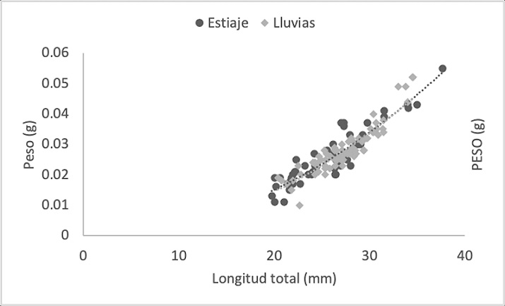 El factor de condición relativa fluctuó de 0.893 en los machos en la temporada de estiaje a 1.26 en las hembras ovígeras en la temporada de lluvias. Los machos y HNO no mostraron diferencias significativas en el análisis de la temporalidad. En las HOV sí se presentó efecto significativo considerando las fechas de muestreo. La condición relativa mostró diferencias significativas por temporada en los datos agrupados (Tabla 4).