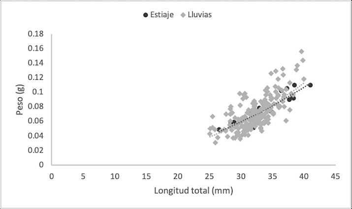 Las hembras, en general, también exhibieron crecimiento alométrico negativo, excepto para las HNO durante la temporada de lluvias, que fue isométrico. La presencia de isometría en hembras de carideos fue observada por Vafidis et al. (2008); sin embargo, este fenómeno ha sido escasamente reportado en camarones, ya que en general los antecedentes describen alometría negativa para hembras en distintas especies de carideos (Cartaxana, 2003; Collins y Petriella, 1999; Rocha et al., 2015; Taddei et al., 2017) y peneidos (Díaz et al., 2014; Leite y Petrere, 2006; Rahman y Ohtomi, 2018; Silva et al., 2015; Udoinyang et al., 2016). La alometría negativa en hembras, se atribuye a la presencia de hembras ovígeras con la reducción en el incremento en peso por el inicio de la madurez sexual y el desove (Maiorano et al., 2002), lo cual puede explicar el crecimiento de las HOV de T. carolinense en ambas temporadas con un sistema de reproducción continua, como sugirieron Bortolini et al. (2019) y Martinez-Mayén et al. (2020). No obstante, se recomienda realizar un mayor número de muestreos a lo largo del año para confirmar si la reproducción continua es una caracterísica de las poblaciones de esta especie en la laguna Madre.