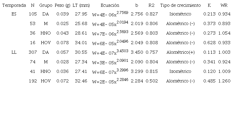 Los valores promedio del factor de condición K, oscilaron entre 0.1131 para datos agrupados en la temporada de lluvias y 0.6280 en hembras ovígeras en la temporada de estiaje. Se encontraron diferencias significativas en el factor de condición de los 4 grupos, en ambas temporadas. No se encontró diferencia significativa en los datos agrupados por época (Tabla 3).