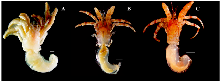 Material examined. 9 M, size range: 0.77 ≤ SL ≤ 4.87 mm; 6 F, size range: 1.72 ≤ SL ≤ 4.93 mm. CCDB 6520.