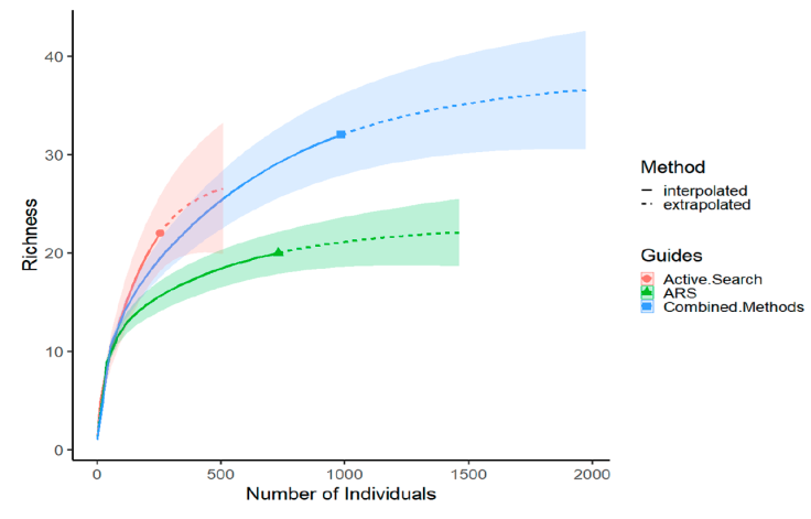 The Shannon diversity index (H) was calculated for the sampling methods: active search, ARS, and combined methods (active search + ARS). Rarefaction curves were also performed to compare the sampling methods. The analyses were carried out using the iNEXT package (Hsieh et al., 2016) in R (R-Core Team, 2020).