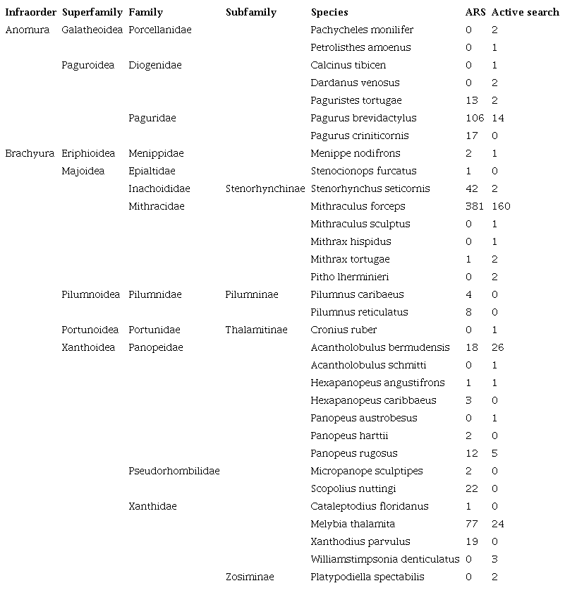 A total of 829 individuals of Brachyura belonging to 25 species, 16 genera, and 8 families (Mithracidae, Epialtidae, Inachoididae, Pilumnidae, Portunidae, Xanthidae, Panopeidae, and Menippidae) were collected. The Panopeidae was the most representative family, with 7 species sampled. The most representative species was Mithraculus forceps A. Milne-Edwards, 1875, with a total of 541 specimens.