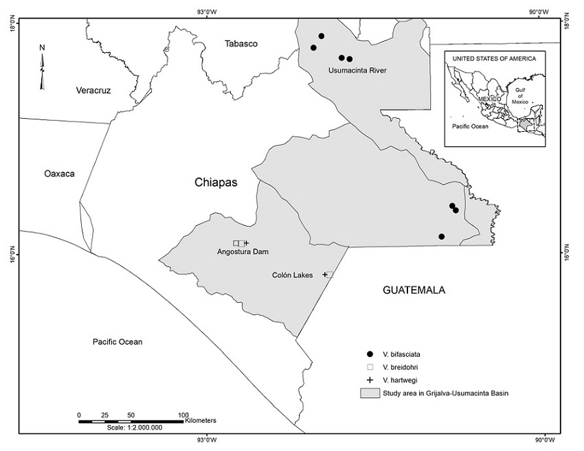 The closely related species V. bifasciata (Steindachner, 1864), V. breidohri (Werner & Stawikowski, 1987), and V. hartwegi (Taylor & Miller, 1980) possess interesting phenotypes for the study of trophic morphology. Molecular phylogenetic analyses have shown few genetic differences among these 3 species (Gómez-González et al., 2018; McMahan et al., 2010; Říčan et al., 2016). Although these species are very similar, certain differences in color pattern, body shape, and pharyngeal teeth have been observed (Gómez-González et al., 2018). Vieja breidohri is sympatric with V. hartwegi in the middle and upper reaches of the Grijalva River basin, while V. bifasciata is widespread in the entire Usumacinta River basin and does not coexist with its close congeners (Miller et al., 2005).