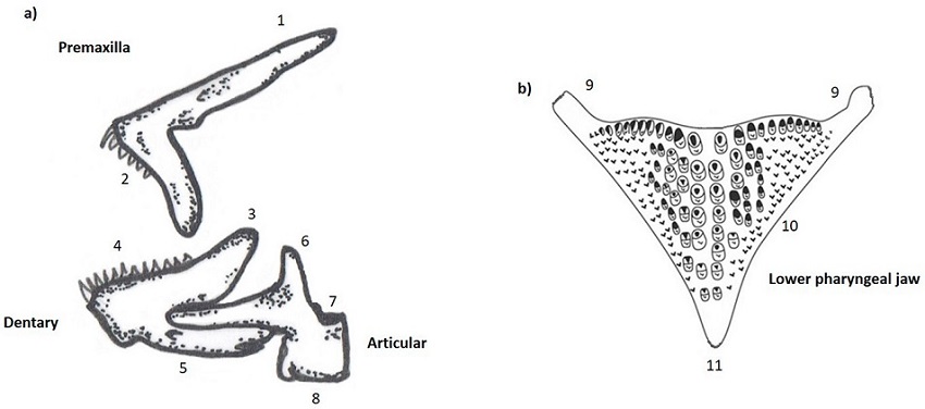 Morphological characters related to feeding are useful discriminant characters in cichlids (Trewavas, 1983; Witte & van Oijen, 1990). Similar to other groups of fishes, the ecological diversification of cichlids has involved resource partitioning. In this process, the adaptive capacity of trophic morphology is crucial and includes form, function, and behavior (Burress, 2015). The trophic morphology of cichlids is closely related to the exploitation and partitioning of food resources, which are potential mechanisms for ecological divergence (Albertson et al., 2003a, b; Hulsey, 2009). Several functional morphological studies have shown that the shape of bone structures of the trophic apparatus can determine biomechanical performance in relation to the capture and processing of food (Albertson & Kocher, 2001; Albertson et al., 2003a; Meyer, 1989; Waltzek & Wainwright, 2003). The traits of these feeding structures have been used to taxonomically discriminate several genera and species of fish, including cichlids (Kassam et al., 2004; Trewavas, 1983; Witte & van Oijen, 1990; Witte & Witte-Maas, 1987). Moreover, features such as the shape and number of teeth in the lower pharyngeal jaw (LPJ) and oral jaw have traditionally been included in descriptions of Neotropical and African cichlids (Alonso et al., 2019; Oliver, 2018).