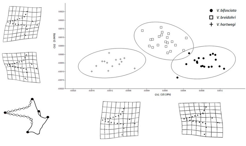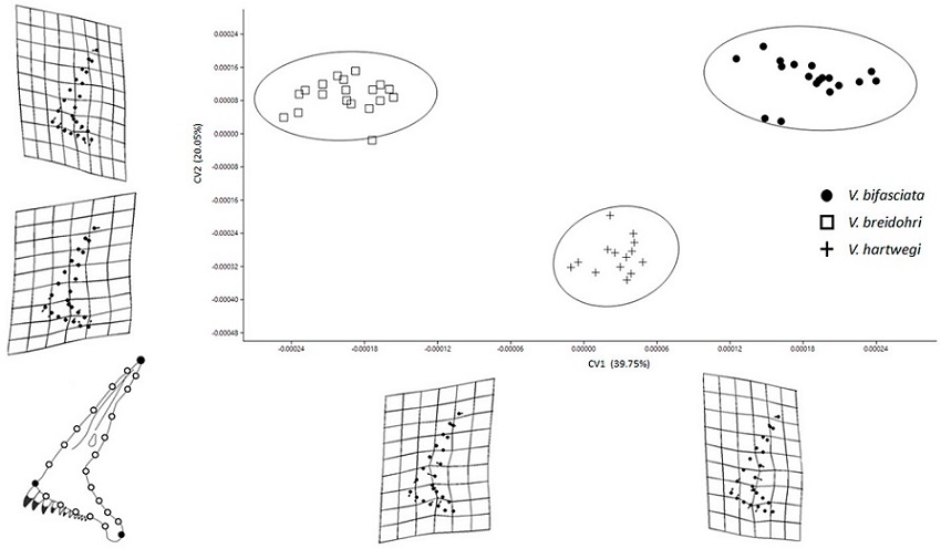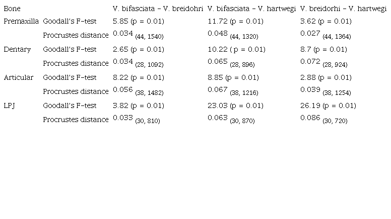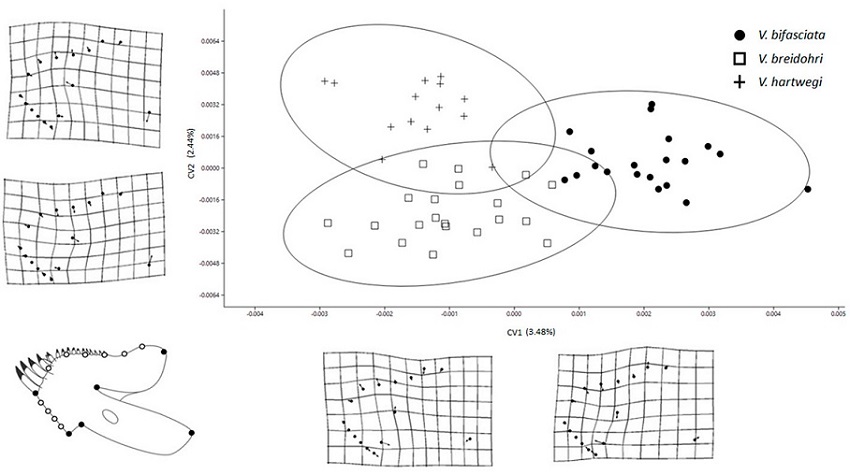 The allometric analysis did not show a significant relationship between size and bone shape. At the intraspecific level, the values of the regression slope (m) were low and the percentage of shape variation explaining size (E) varied from 6.03 to 36.98%. Premaxilla: V. bifasciata (m = 0.044, E = 33.11%), V. breidohri (m = -0.019, E = 36.98%), and V. hartwegi (m = -0.003, E = 24.76%). Dentary: V. bifasciata (m = 0.03, E = 12.04%), V. breidohri (m = 0.004, E = 7.6%), and V. hartwegi (m = 0.004, E = 14.71%). Articular: V. bifasciata (m = -0.008, E = 13.48%), V. breidohri (m = -0.003, E = 17.3%), and V. hartwegi (m = -0.007, E = 8.34%). LPJ: V. bifasciata (m = 0.004, E = 6.03%), V. breidohri (m = 0.005, E = 23.91%), and V. hartwegi (m = 0.022, E = 9.44%). At the interspecific level, we detected relatively low linearity values in the regression analyses and in the variation explained for the articular (m = -0.01, E = 7.85%), dentary (m = 0.013, E = 6.09%), premaxilla (m = 0.0004, E = 21.02%), and LPJ (m = -0.009, E = 8.38%).