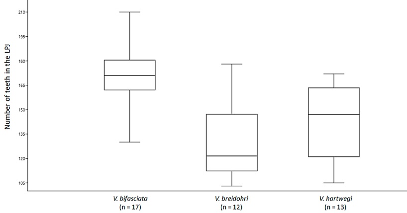 Based on the analysis of covariance (ANCOVA), no significant effect of centroid size was found (p > 0.05, F = 2.387) upon comparing the number of teeth in the LPJ. Significant differences in V. bifasciata were observed when compared to V. breidohri and V. hartwegi (p < 0.05, F = 12.96). Vieja bifasciata had 130 to 210 teeth (), V. breidohri had 103 to 178 (), and V. hartwegi had 105 to 172 () (Fig. 7).