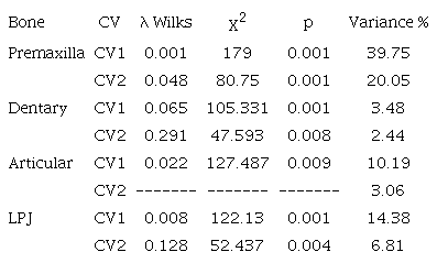 Although the CVA revealed significant differences in shape among the 4 bones in the 3 studied species (Table 1, p < 0.05), the obtained Wilks lambda (λ) values were relatively low. The premaxilla and LPJ showed the greatest differentiation among species (Figs. 3, 6) and explained variance (59.8 and 20.48%, respectively) (Table 1). The dentary exhibited significant differences in the first 2 axes (Fig. 4) with less explained variance (5.52%; Table 1). The articular only recovered a significant CV1 explaining 10.19% of the variance (Fig. 5). Paired comparisons between species also indicated significant differences in the shape of the 4 bones (Table 2).