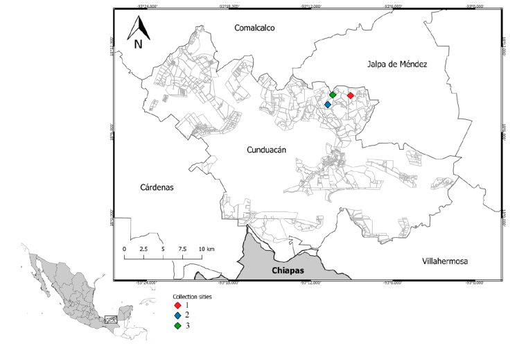 The collection sites were named as: site 1, 18°08’34.8” N, 93°08’66.4” W; site 2, 18°07’56.0” N, 93°10’46.1” W; and site 3, 18°07’97.5” N, 93°10’24.2” W (Fig. 1). Specimens of each species collected were preserved in ethanol and afterwards, separated, cleared, dissected, and mounted on microscope slides in Canada balsam using the technique described by Borkent and Spinelli (2007). A set of remaining specimens was preserved directly in ethyl alcohol.