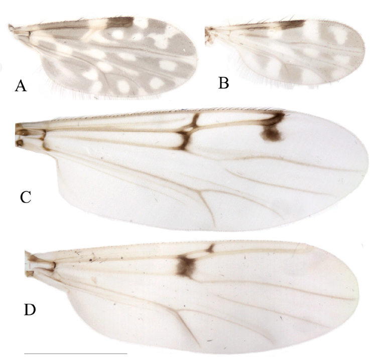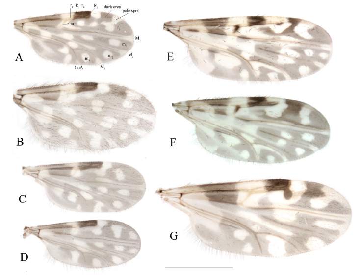 4(1) Wing with contrasting pattern of dark and pale spot; cell r2 usually longer than cell r1 (Fig. 2A-D) ………………………………………………………………………………….5
