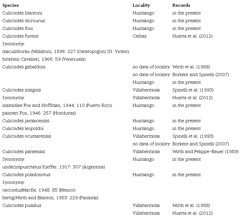 This species is considered an important virus vector in the Neotropical region (Hoch et al., 1990; Mellor et al., 2000); with a wide distribution from southern USA (Wirth et al., 1985) to Argentina (Borkent & Grogan, 2009). In Mexico, it was previously reported from San Luis Potosí, Quintana Roo (Blanton & Wirth, 1979), Tabasco and Veracruz (Wirth & Felippe-Bauer, 1989). Huerta et al. (2012) provided the first record from Chiapas and additional records from San Luis Potosí and Veracruz. We include a new locality in state of Tabasco.