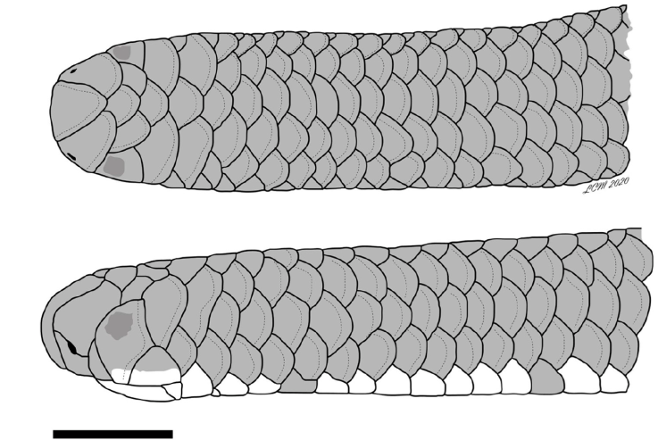 Description of the holotype. Middorsal scales 252 between the rostral scale and the tail tip; 14 rows of smooth, imbricate scales around body, constant between head and level in front of cloaca; 10 rows of scales around midpoint of tail; subcaudals 14, not including tail tip; cloacal plate undivided; rostral scale curving over snout, posterodorsal end rounded; nasal divided horizontally, nostril between upper and lower nasals, located medially between the suture; lower nasals extend to lip; four scales bordering mouth on each side behind rostral (lower nasal, anterior supralabial, ocular, and posterior supralabial); anterior supralabials 1/1, undivided; posterior supralabials 1/1, higher than wide, barely touching corner of mouth; parietals large, three times higher than wide, contacting posterior supralabials; supraoculars 1/1, equal in size to the frontal; occipitals 1/1, subequal to parietals, undivided; temporals 1/1, preventing contact between occipitals and posterior supralabials; postfrontal slightly wider than frontal, and separating supraoculars; interparietal slightly wider than postfrontal and interoccipital (Fig. 2); mental scale about three and a half times wider than long; infralabials 4/4, first pair separated medially by postmental, second pair larger than first and third and separated from each other by three median chin shields, fourth pair slender; body cylindrical from head to tail, with ultimate scale terminating in a well-defined spine.